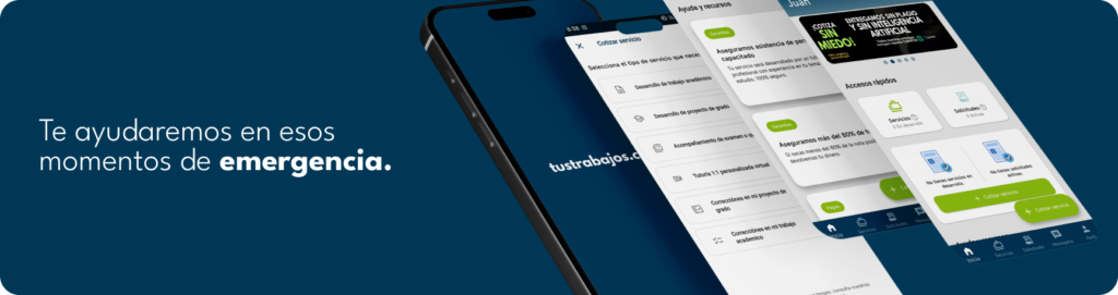 Nos esforzamos mucho en cubrir todas las necesidades de nuestros clientes, por ese motivo contamos con los siguientes servicios: Desarrollo de trabajos, acompañamiento y desarrollo de proyectos de grado, ayuda en examen/parcial, tutorías y asesorías personalizadas, pasamos documentos por la plataforma antiplagio Turnitin, correcciones y aplicación de normas a trabajos ya realizados por el estudiante, presentaciones de alto impacto.